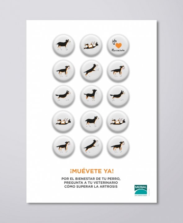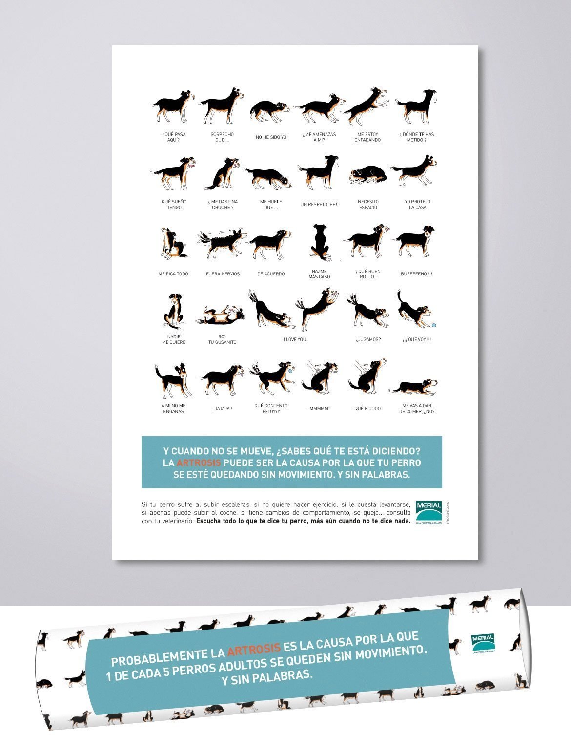 Jugamos con la única forma que tiene un perro para comunicarse con su dueño, el lenguaje corporal. Algo que si sufre de artrosis no podría realizar. Por ello, creamos un diccionario gráfico en cual explicábamos, a través de posturas, lo que un perro puede querer decir. Una forma original y simpática de dar voz al mejor amigo del hombre para conseguir concienciar a sus dueños.